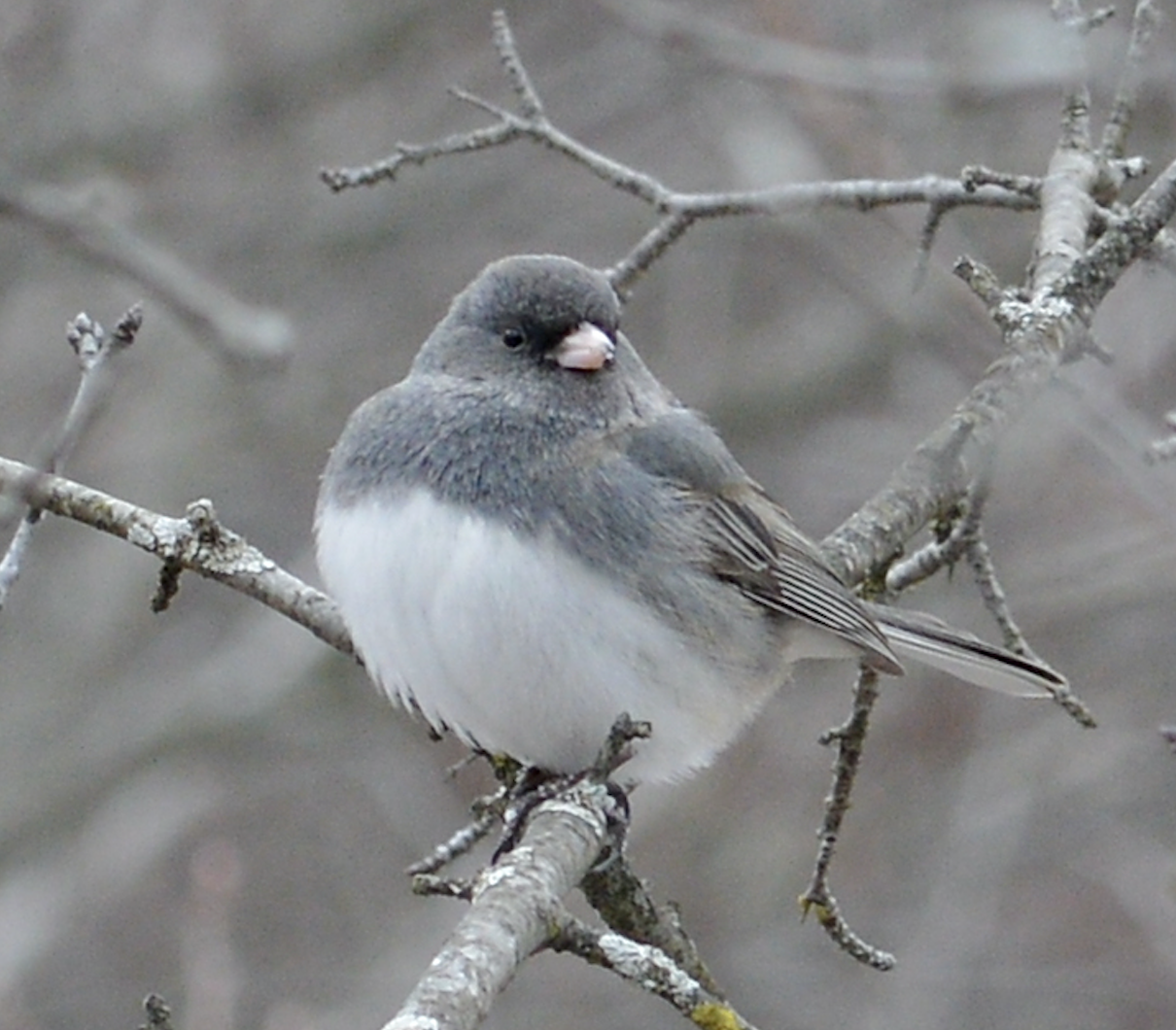 A trait of juncos is their bright-white outer tail feathers that flash open from time to time, when the birds are in flight. Well, these were not only vocal juncos, but showy ones. Their tails appearing to streak a bright white above the snow and vegetation. The juncos arrived with the fanfare of plume-waving marchers at a Mardi Grad parade.