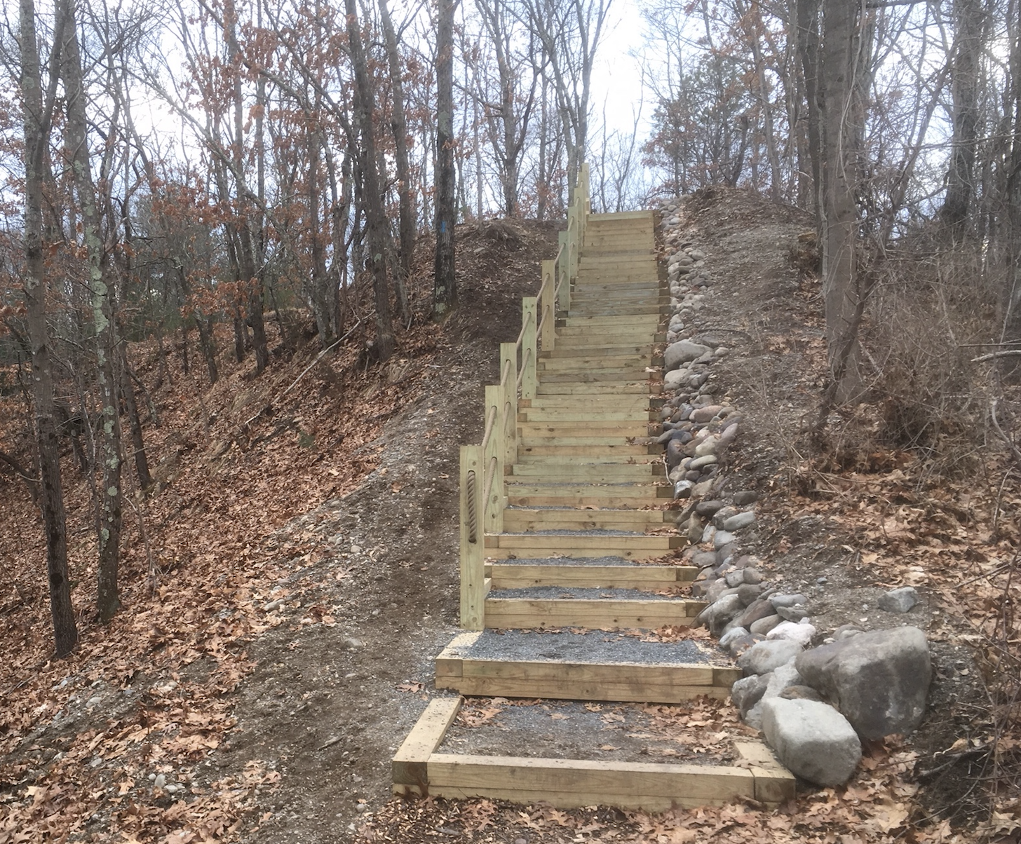 Then, we climbed a relatively new staircase of wood, rope, and stone up a slope and into a piney woods. The dominant conifer was the uncommon pitch pine.