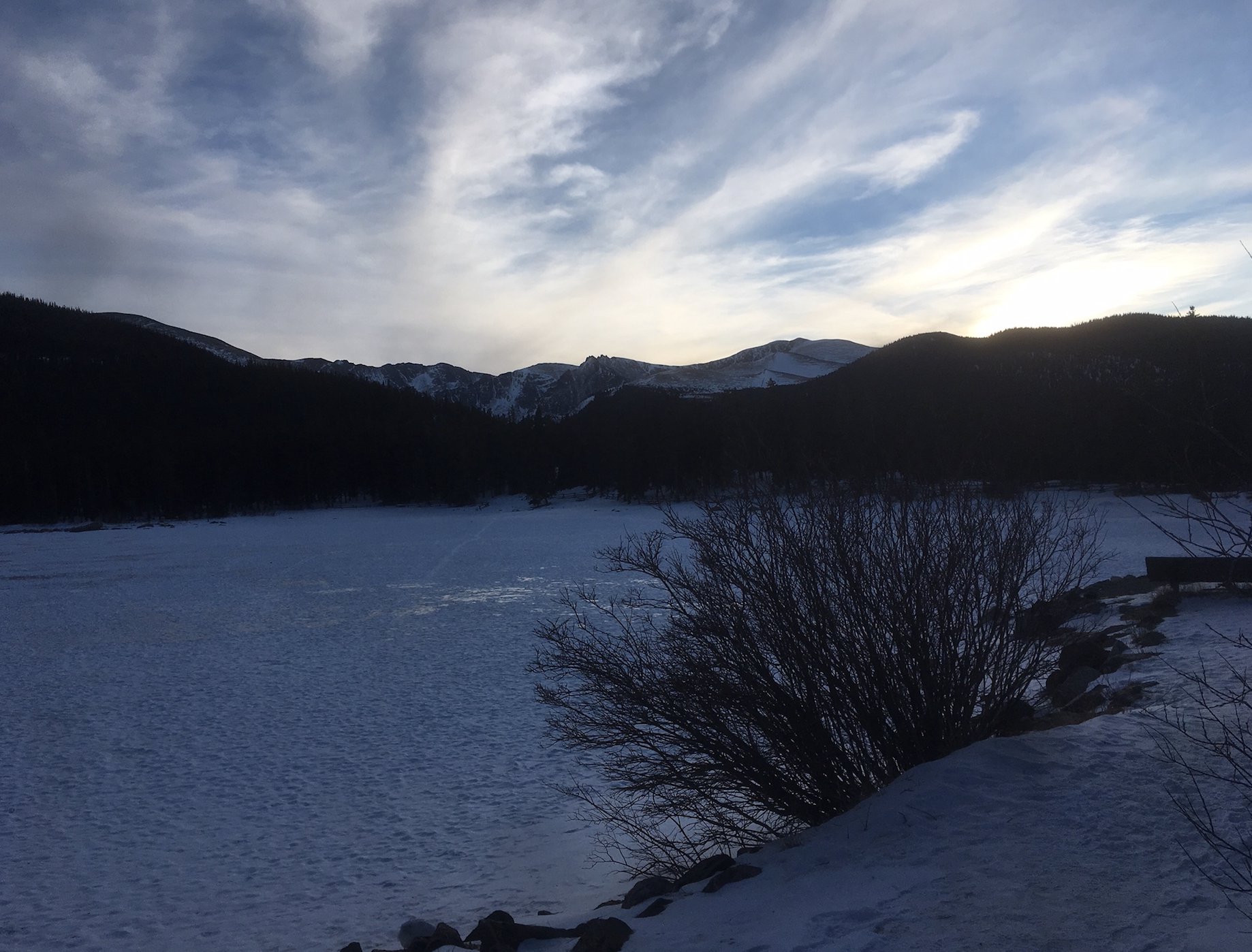 The silver-and-gold of a setting sun behind 14,000-foot Mount Evans illuminated the frozen lake upon which several fellow tour-goers strolled. The lake was solid ice more than a foot deep, making it unlikely anyone would fall through, said our tour guide.