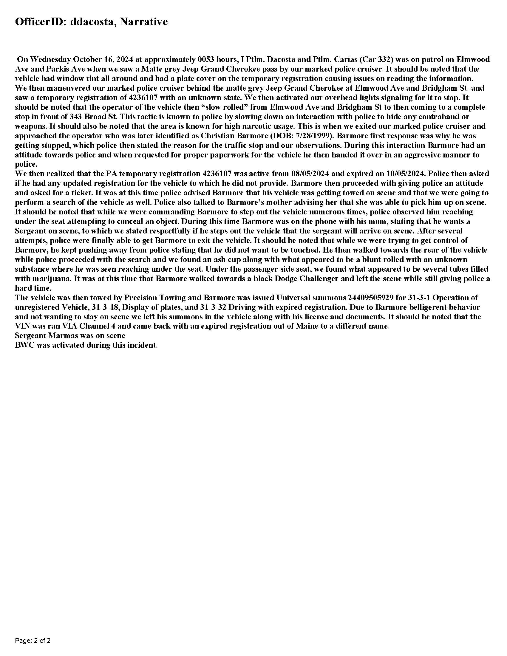 During this time Barmore was on the phone with his mom, stating that he wants a Sergeant on scene, to which we stated respectfully if he steps out the vehicle that the sergeant will arrive on scene. After several attempts, police were finally able to get Barmore to exit the vehicle. It should be noted that while we were trying to get control of Barmore, he kept pushing away from police stating that he did not want to be touched. He then walked towards the rear of the vehicle while police proceeded with the search and we found an ash cup along with what appeared to be a blunt rolled with an unknown substance where he was seen reaching under the seat. Under the passenger side seat, we found what appeared to be several tubes filled with marijuana. It was at this time that Barmore walked towards a black Dodge Challenger and left the scene while still giving police a hard time.
