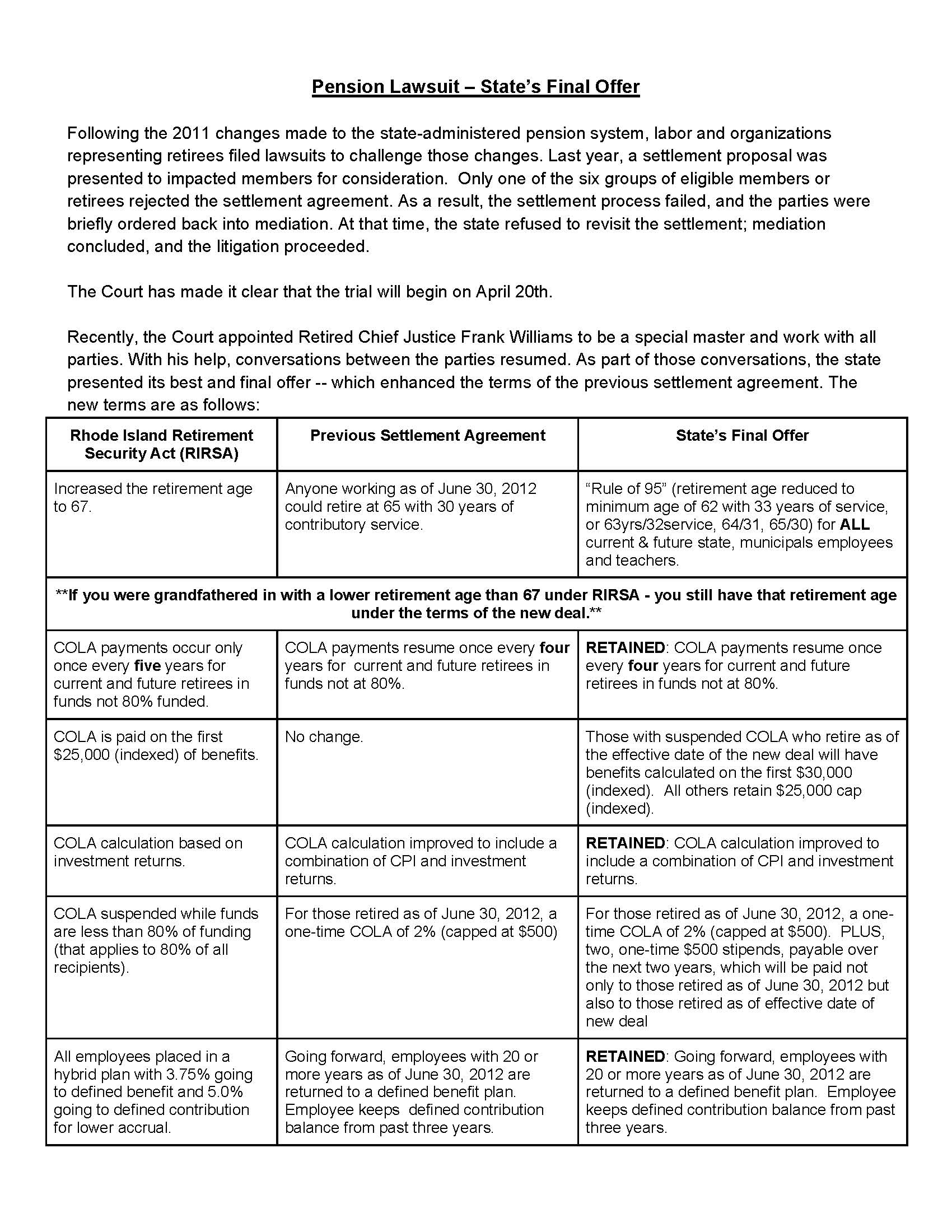 If the vote to accept the deal passes, Judge Sarah Taft-Carter has final approval and the legislature would be directed to pass it into law. If the vote does not pass, then the trial would proceed on April 20 and pensioners would remain under the changes passed in 2012, not the proposed settlement from last year.