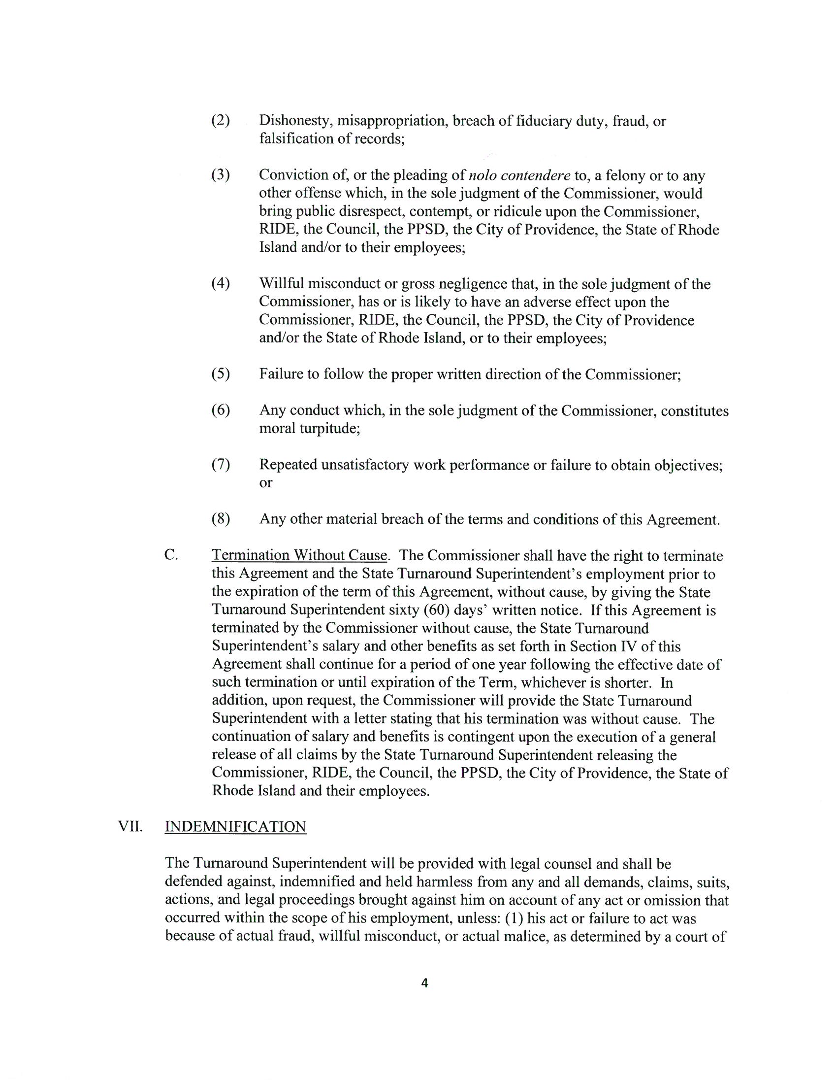 (4) Willful misconduct or gross negligence that in the sole judgment of the Commissioner, has or is likely to have an adverse effect upon the Commissioner, RIDE, the Council, the PPSD, the City of Providence, the State of Rhode Island and/or to their employees;