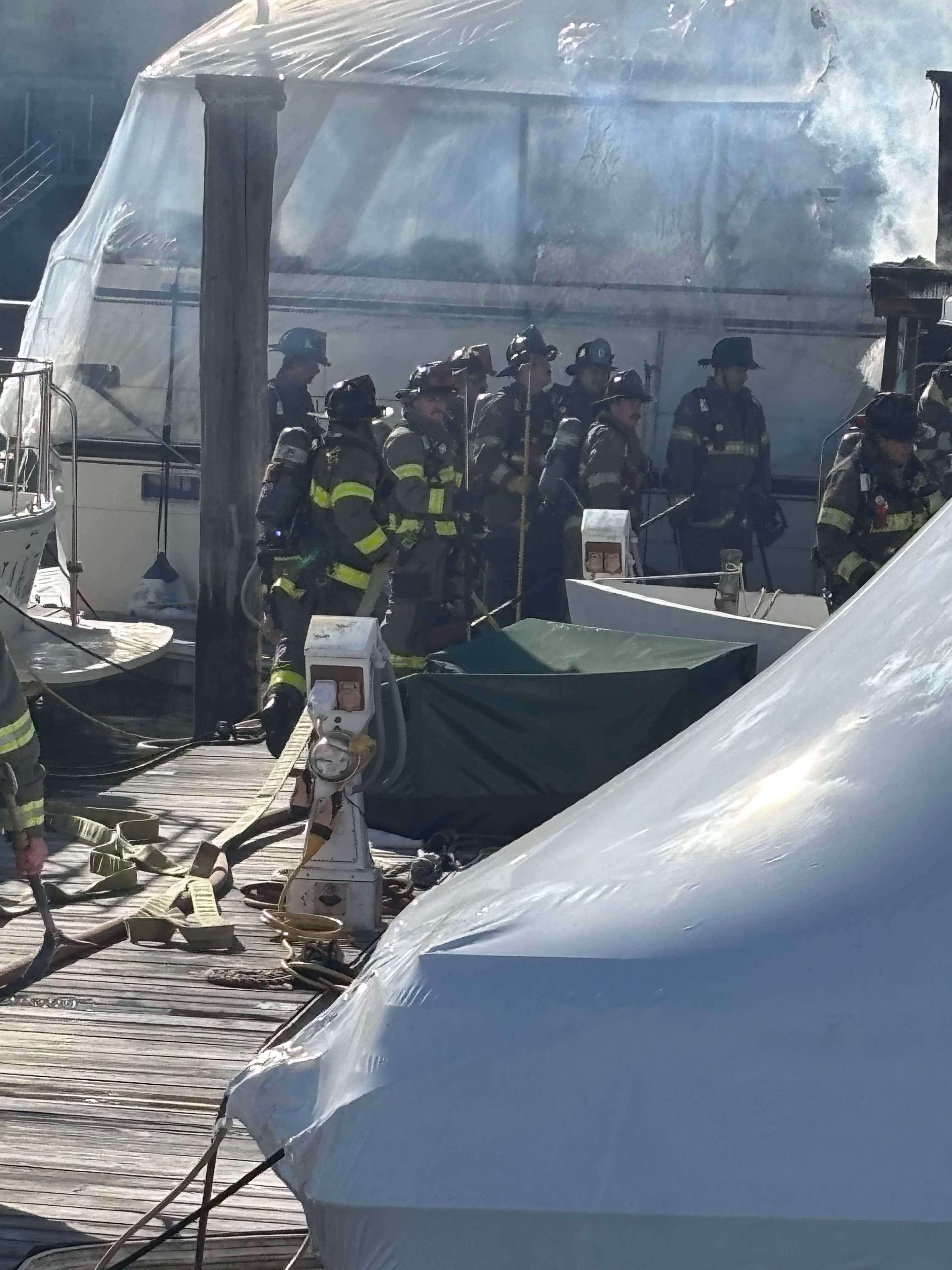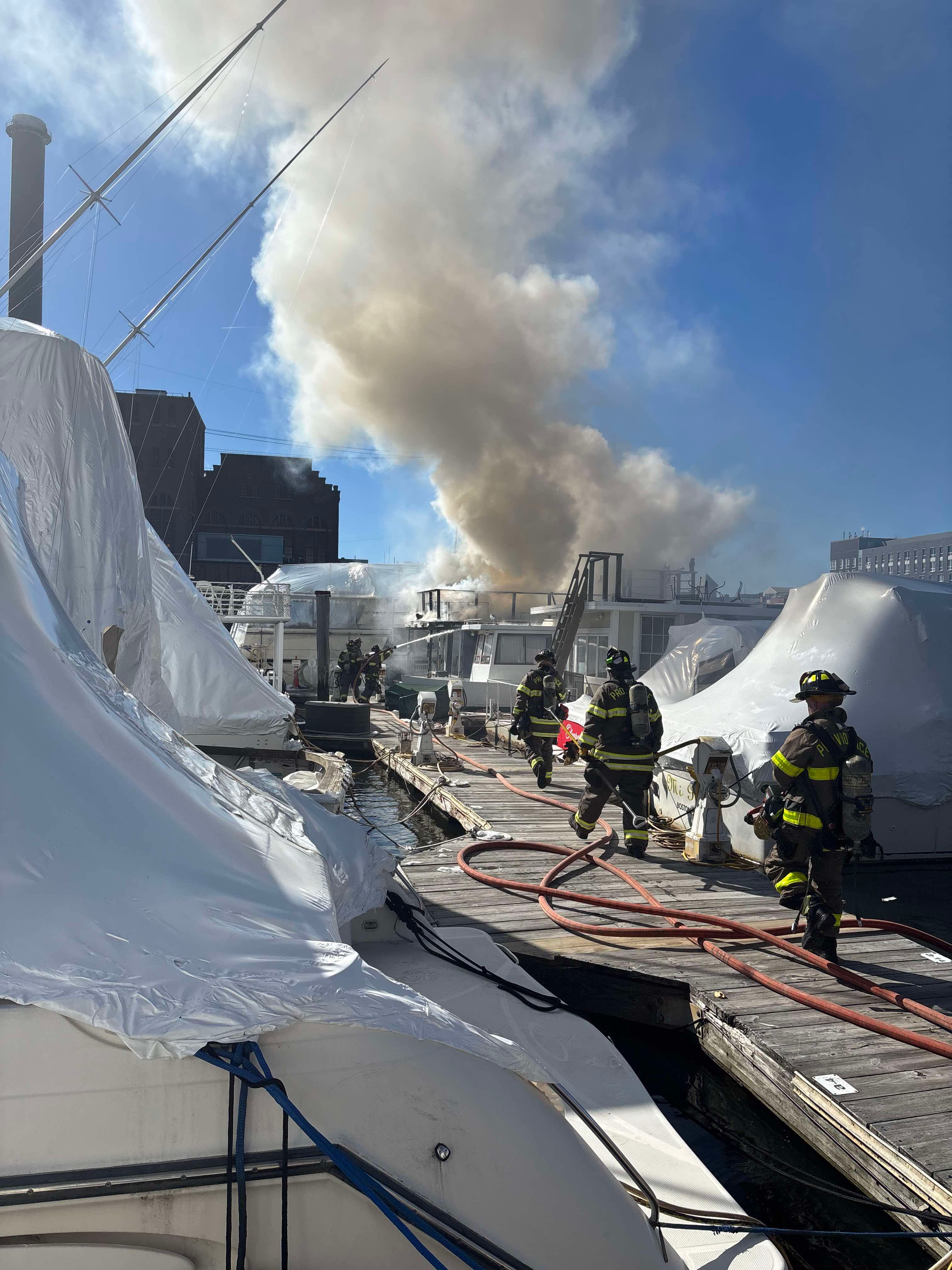 On Saturday, a boat docked at the Providence Marina off of Bridge Street in the Fox Point neighborhood was engulfed in flames.