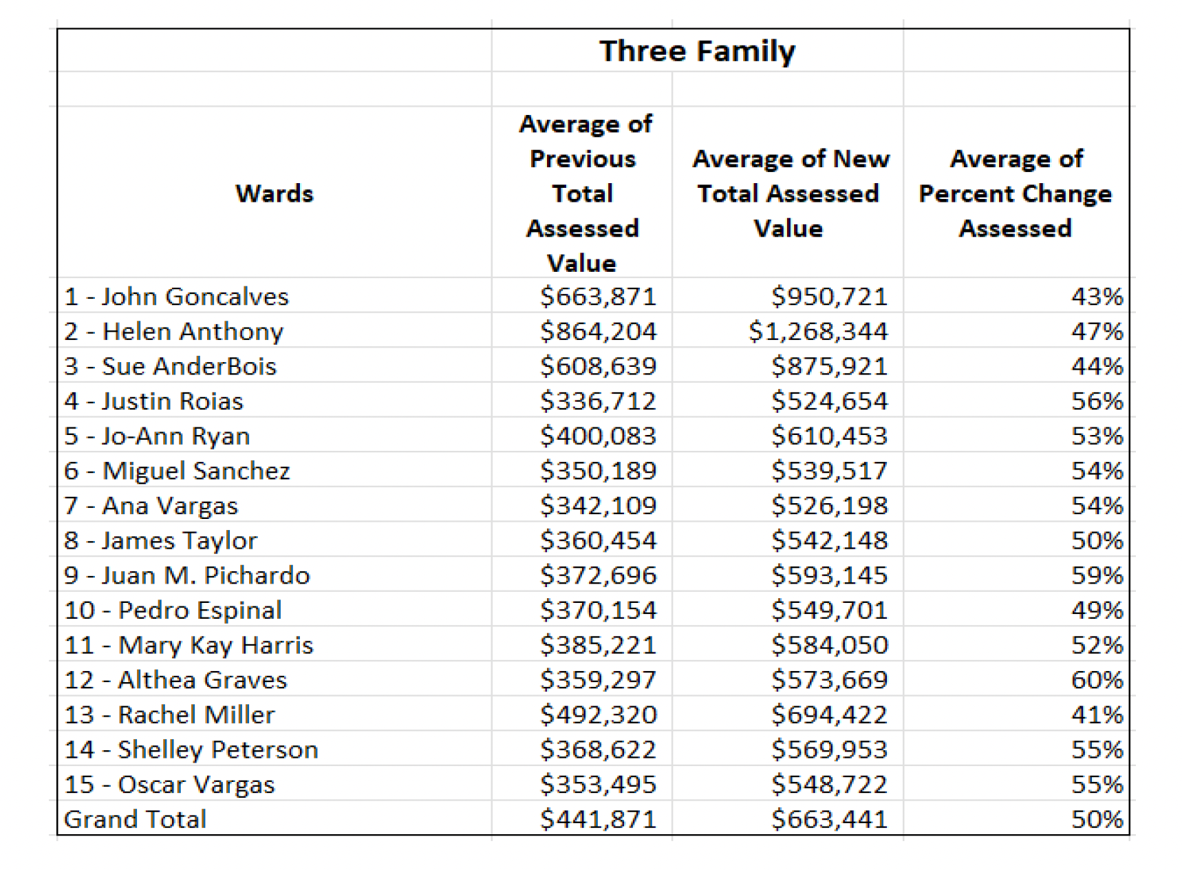 The assessed value of three-family homes is the highest in Ward 2, at $1,268,344. The ward that saw the highest percentage increase was Ward 12, which saw a 60% increase.