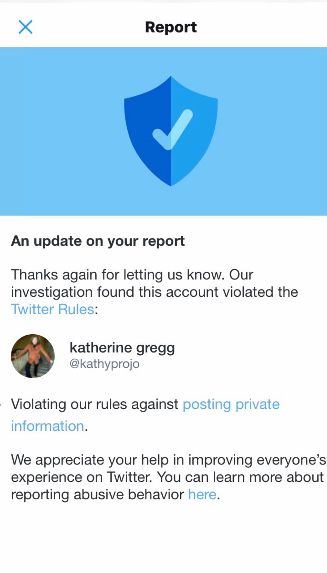 In a message from Twitter to the individual whose private information was exposed by Gregg, the company stated, “Thank you for letting us know. Our investigation found this account [Katherine Gregg] @kathyprojo [for] violating our rules against posting private information."