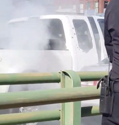 Directly after the police end shooting, the pickup moves forward into the vehicle in front of it. Smoke appears as the shooting victim, male driver leans against the steering wheel and the wheels spin.