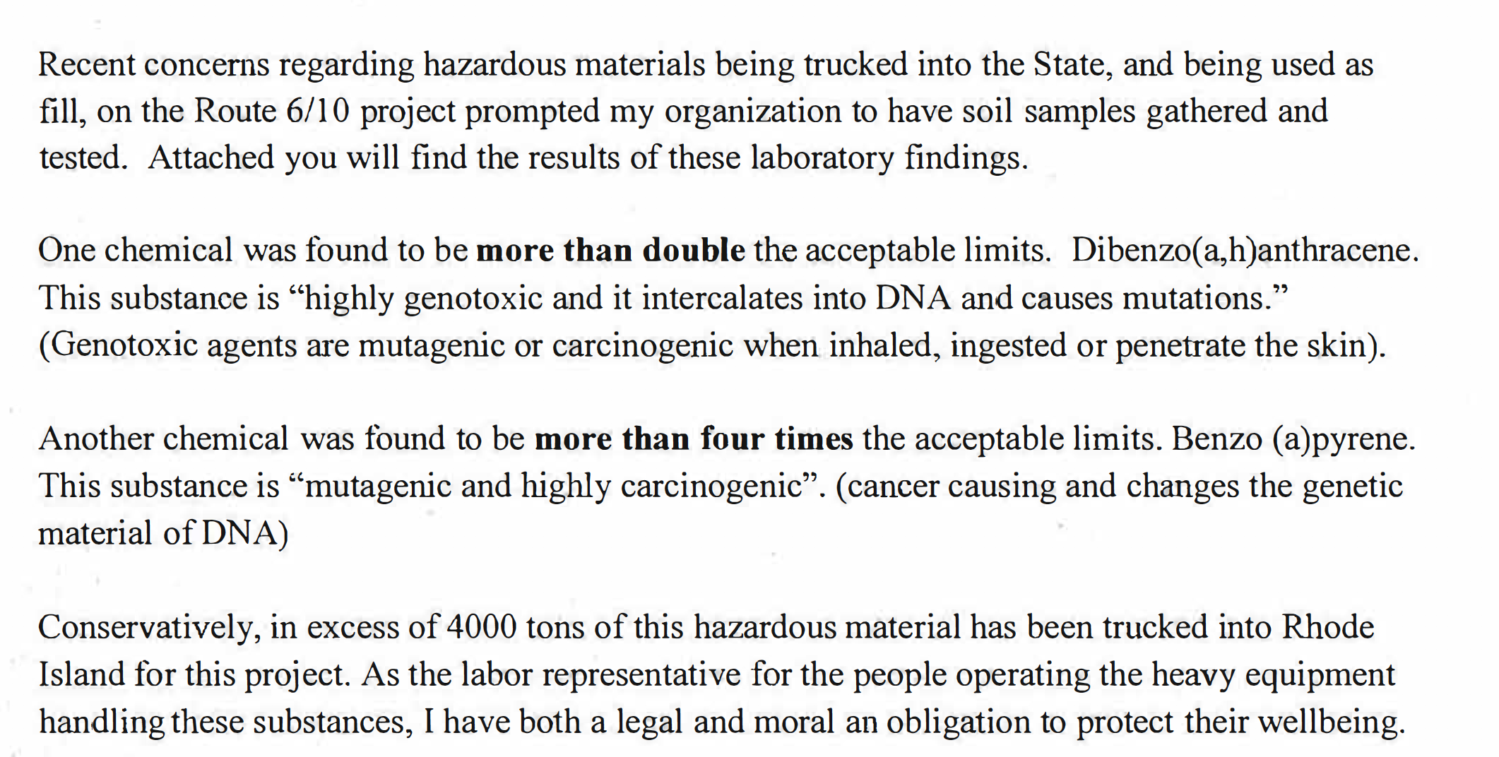 According to a top union official who raised concerns about the contractor on the $410 million 6/10 construction project, Barletta Engineering/Heavy Division, the Massachusett-based company, allegedly trucked in material from projects in Massachusetts and Pawtucket that contained contaminants.