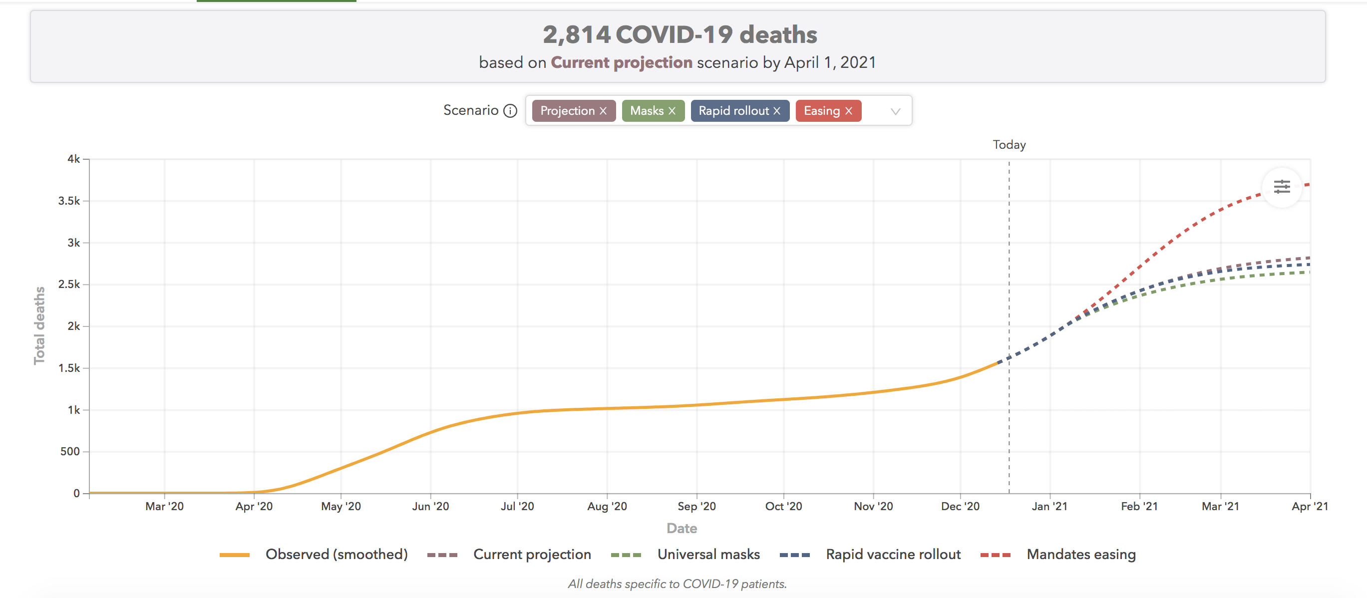 National modeling from the University of Washington’s IHME shows that the spread was little impacted by Raimondo’s strategy and the projection for Rhode Island has now jumped to 2,814 COVID-19 deaths based on current projection scenario by April 1, 2021.