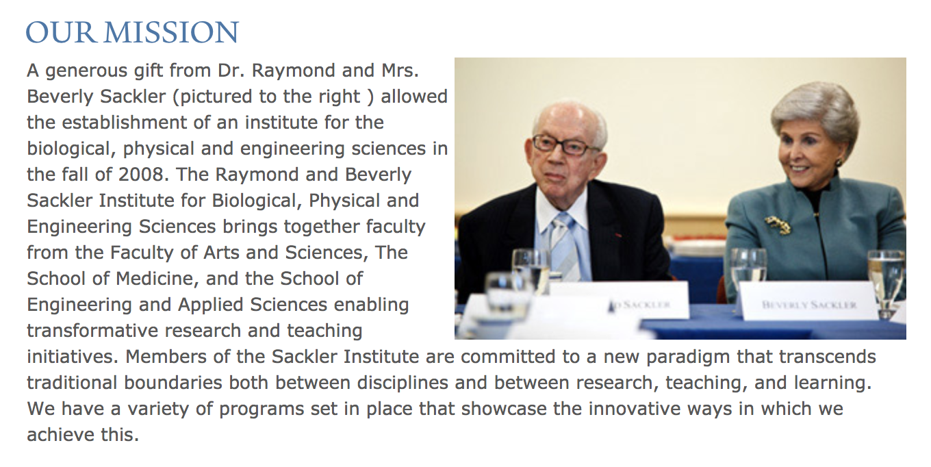 The Sacklers have endowed two professorships at the School of Medicine and funded the Raymond and Beverly Sackler Institute for Biological, Physical and Engineering Sciences, among other gifts at Yale, according to the Yale Daily News.