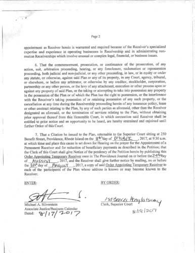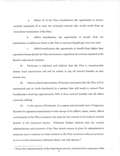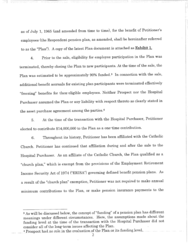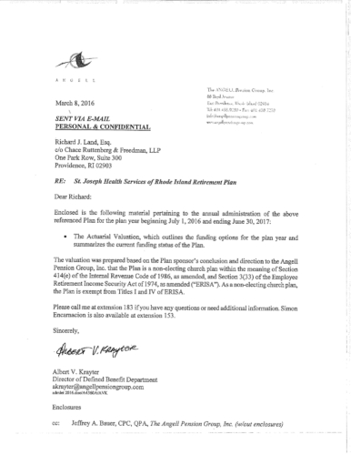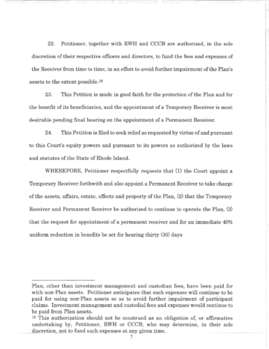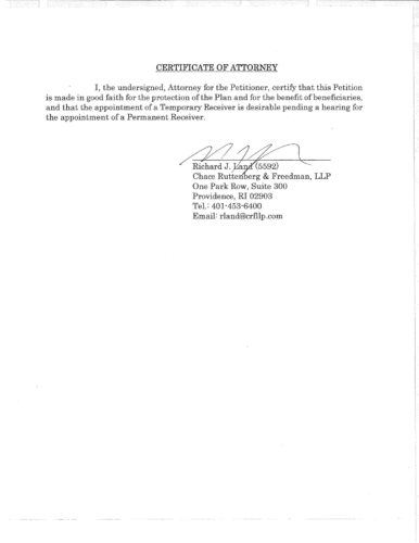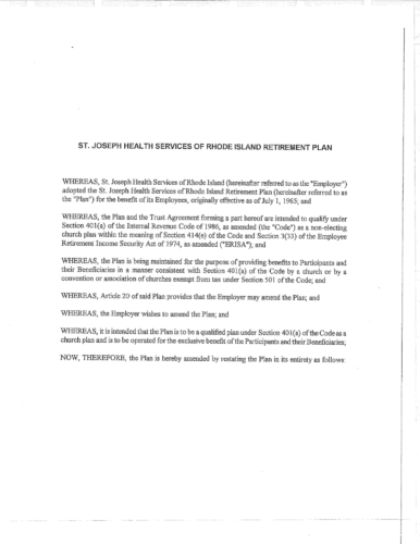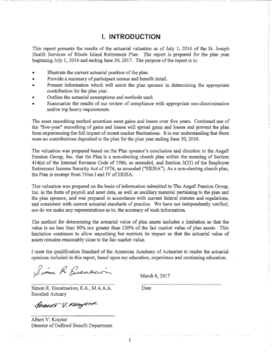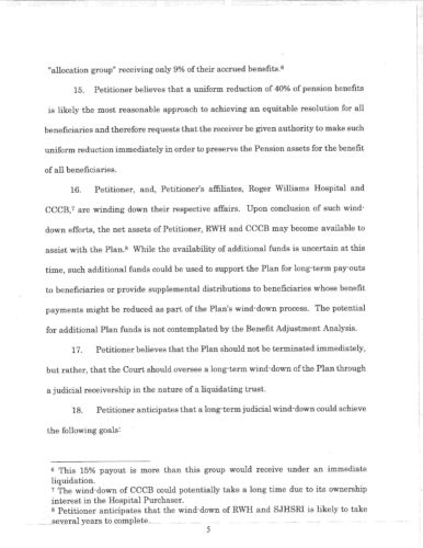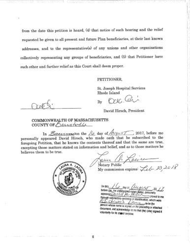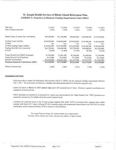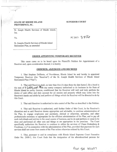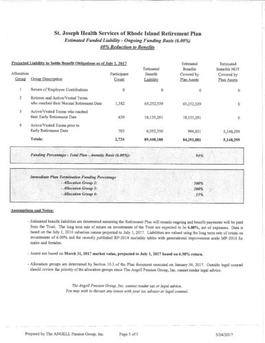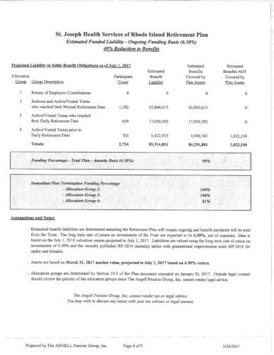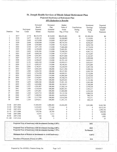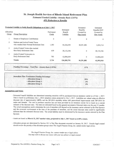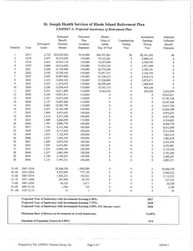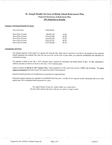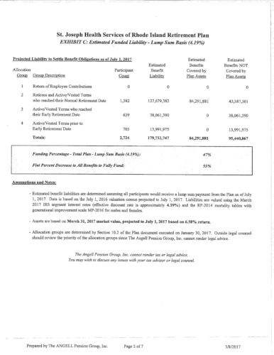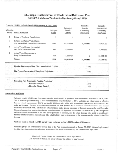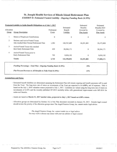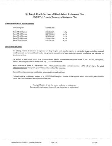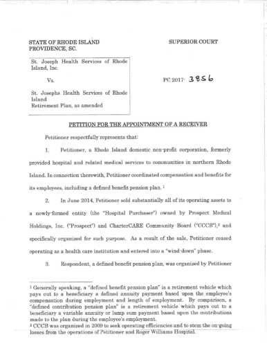 Attached are more than 100 pages of documents from the petitioner's filing in Superior Court for bankruptcy of the St. Joseph Health Services pension fund. The fund presently has assets of approximately $85 million and a shortfall of $43 million according to court documents and the court appointed receiver, attorney Stephen Del Sesto.