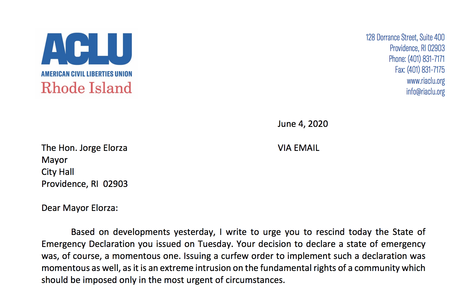 In a letter to Elorza, the ACLU's executive director Steven Brown said that “despite your order’s claim that this draconian curfew was necessary to protect the city’s residents from ‘severe endangerment and harm to their health, safety and property,’ the danger apparently is not severe enough to interfere with the right of residents and non-residents alike to venture out and enjoy a night of coq au vin with their friends at any of Providence’s admittedly fine dining establishments.” Brown called it “impossible to reconcile this decision with either the premise of your emergency order or the terms of the order itself limiting the people who can be out at night.”