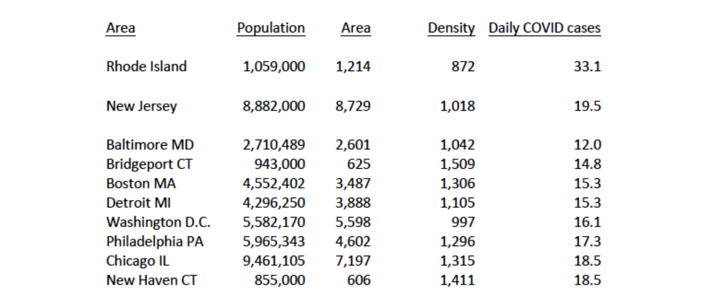 “Density” is often used as an excuse for Rhode Island’s dreadful numbers and abysmal management of the pandemic. However, it’s not a forgone conclusion. There are more densely populated places, both states and metropolitan areas (to say nothing of countries), which have managed to act in prudent ways to keep their infection rates much lower than Rhode Island.