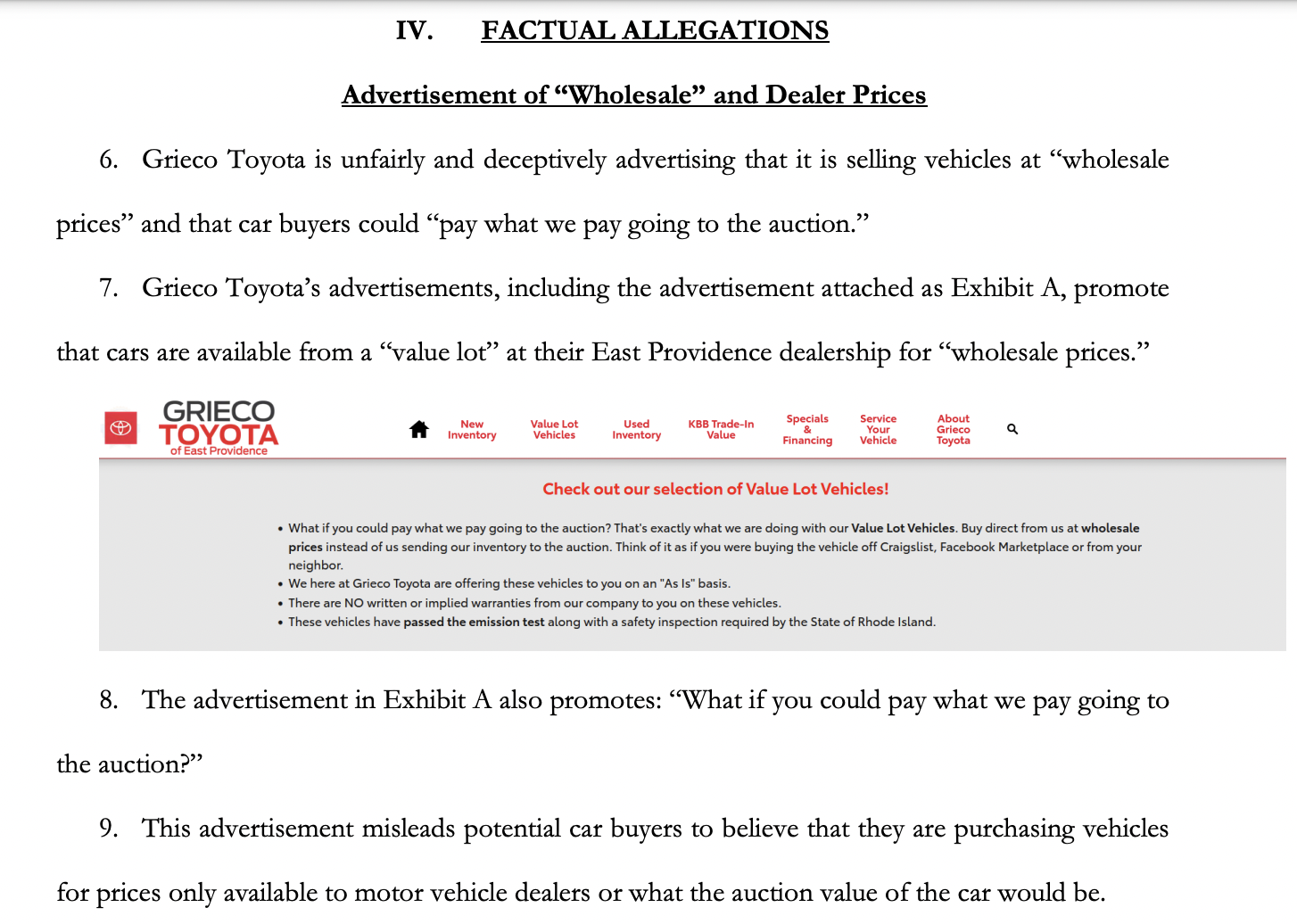 Grieco Toyota is alleged to deceptively advertise vehicles for sale at “wholesale prices” and represent that buyers could “pay what we pay going to auction.”