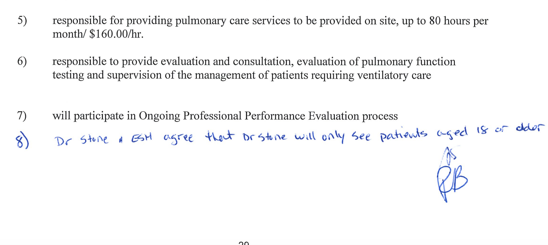 Handwritten on Stone’s contract is a statement that says Stone will not treat patients under 18 years of age. Daly is not a signatory to the agreement. It is unclear when the provision was added into his agreement or who added it.