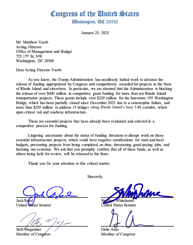 GET THE LATEST BREAKING NEWS HERE -- SIGN UP FOR GOLOCAL FREE DAILY EBLASTIn a letter dated January 25, 2025 and addressed to Matthew Vaeth, the Acting Director of the Office of Management and Budget, Senators Jack Reed and Sheldon Whitehouse and Representatives Seth Magaziner and Gabe Amo wrote that they are concerned with the “lingering uncertainty about the status of funding” as it “threatens to disrupt work on [this] essential infrastructure project.”