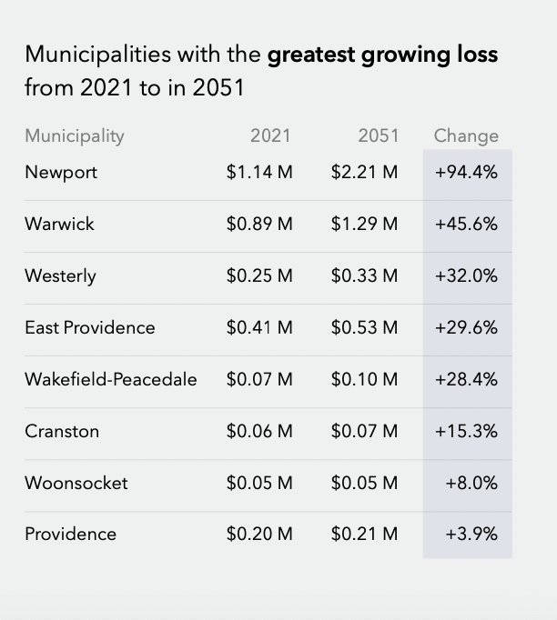 GET THE LATEST BREAKING NEWS HERE -- SIGN UP FOR GOLOCAL FREE DAILY EBLASTIn Newport, flood loss cost is forecasted to jump 94%, from $1.14 million in 2021 to $2.21 million in 2051.