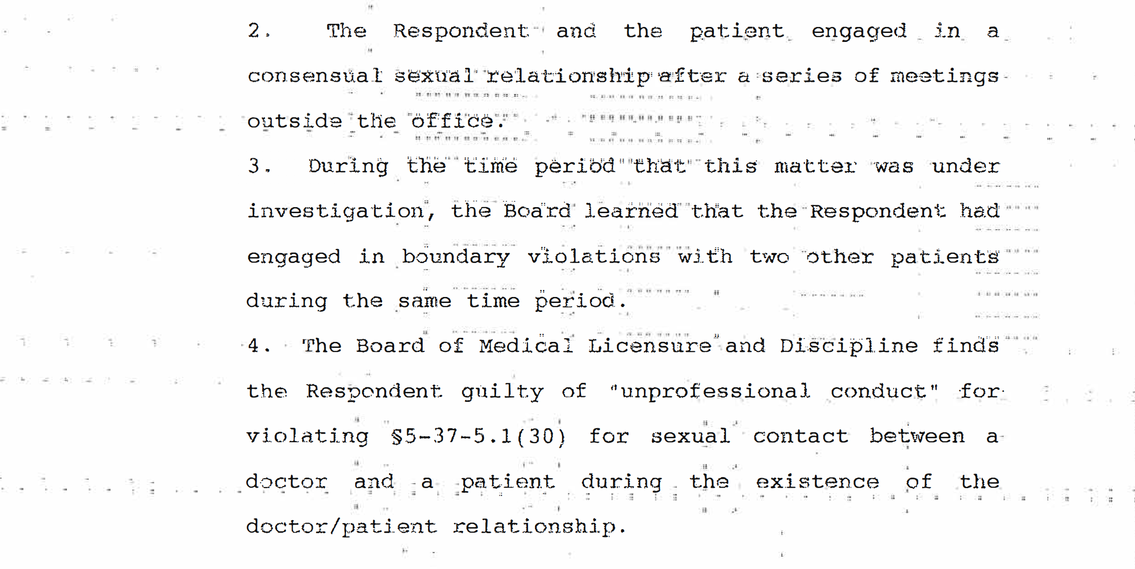 According to the disciplinary documents, “The Respondent and the patient engaged in a consensual sexual relationship after a series of meetings outside the office. During the time period that this matter was under investigation, the Board learned that the Respondent [Petteruti] had engaged in boundary violations with two other patients during the same time period. The Board of Medical Licensure and Discipline finds the Respondent guilty of "unprofessional conduct" for violating §5-37-5 .1 ( 30) for sexual contact between a doctor and a patient during the existence of the doctor/patient relationship."