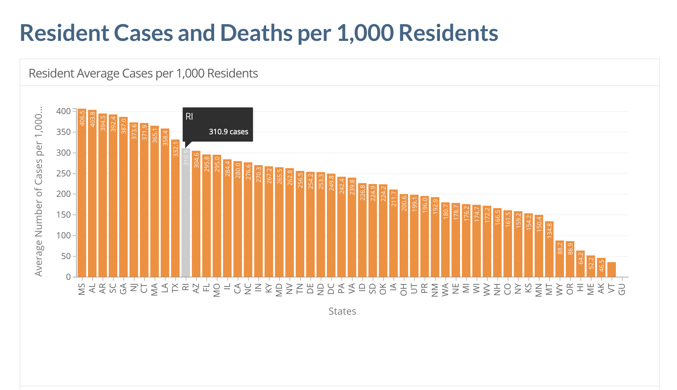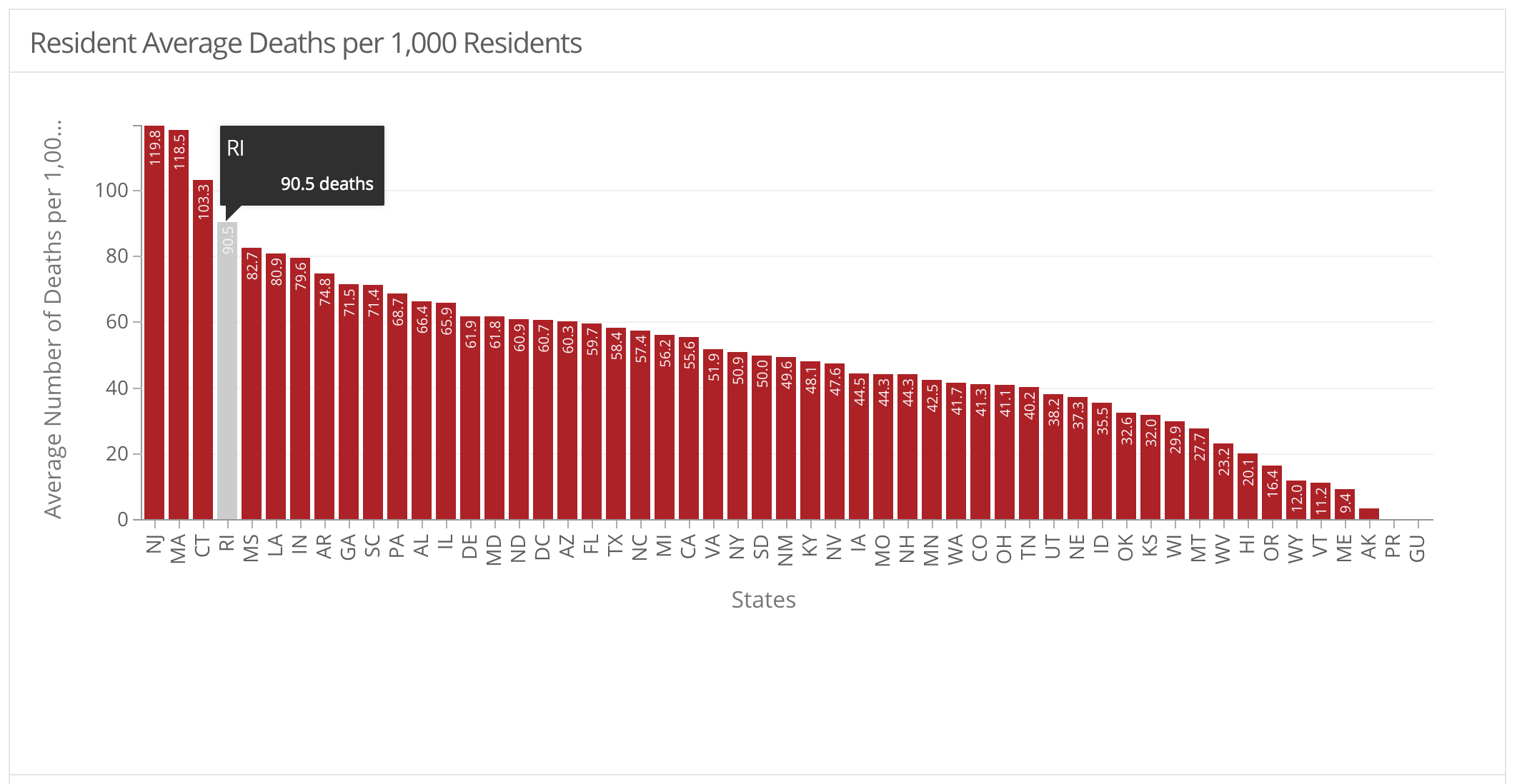 And most disturbing is that Rhode Island's nursing homes have the 4th highest number of deaths per nursing 1,000 nursing home residents. More than 90 in 1,000 have died per capita versus in Maine where just 9 in 1,000 nursing home residents have died.