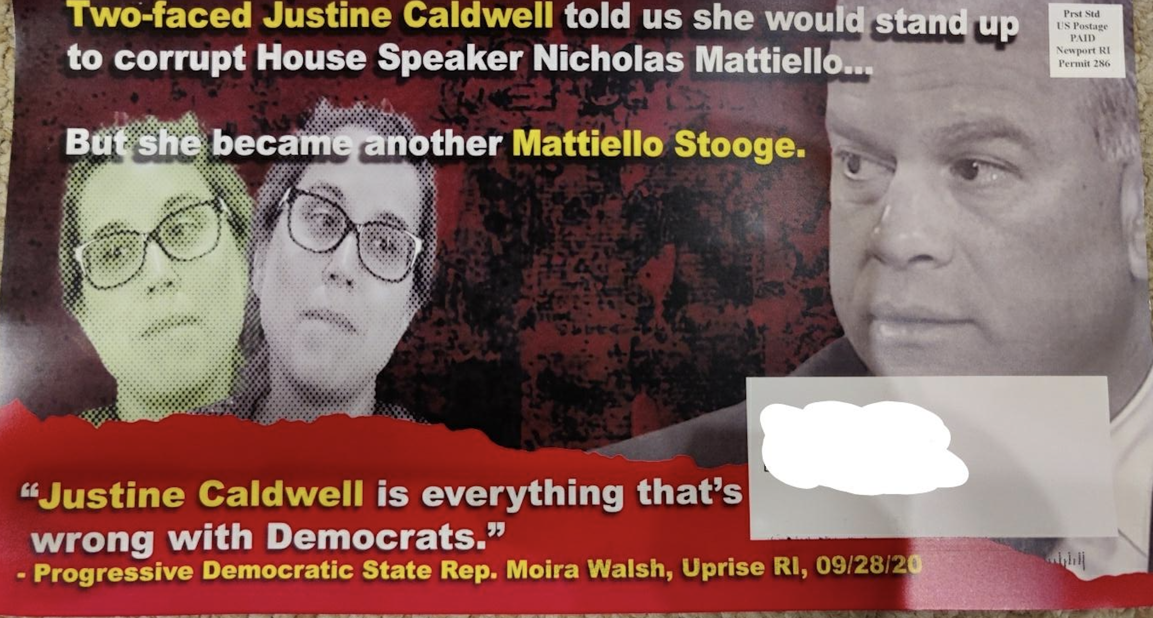 In late October of 2020, just two weeks before the highly contested race between former Republican State Representative Anthony Giarrusso and the woman who defeated him in District 30 (East Greenwich, West Greenwich) in 2018, sitting Democratic State Representative Justine Caldwell, a series of mailers were sent to voters in East Greenwich.
