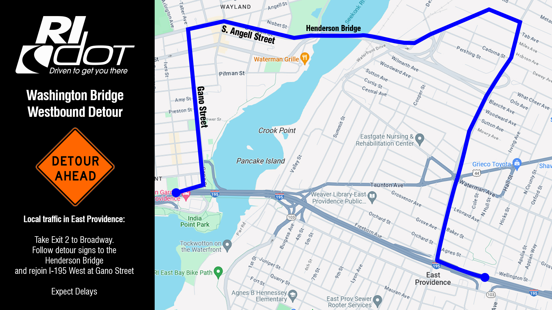 GET THE LATEST BREAKING NEWS HERE -- SIGN UP FOR GOLOCAL FREE DAILY EBLAST"This will require a closure of two lanes on I-195 East in the area of Exit 1A (India Street) starting at 9 a.m. tomorrow, Tuesday, December 12. Depending on the severity of what is found from the initial work, the repair could take three months or more. Beginning immediately and during the time that it takes to make the repairs and reopen the westbound side, travelers are asked to take the marked detour routes," said RIDOT.