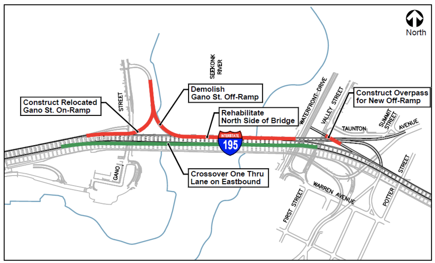 “The first phase of construction will focus on the new on- and off-ramp structures. This phase involves the demolition of the original Gano Street Off-Ramp paired with the construction of the new Gano Street On-Ramp. The new Waterfront Drive Off-Ramp requires an overpass, which will also be constructed in Phase 1,” writes RIDOT.