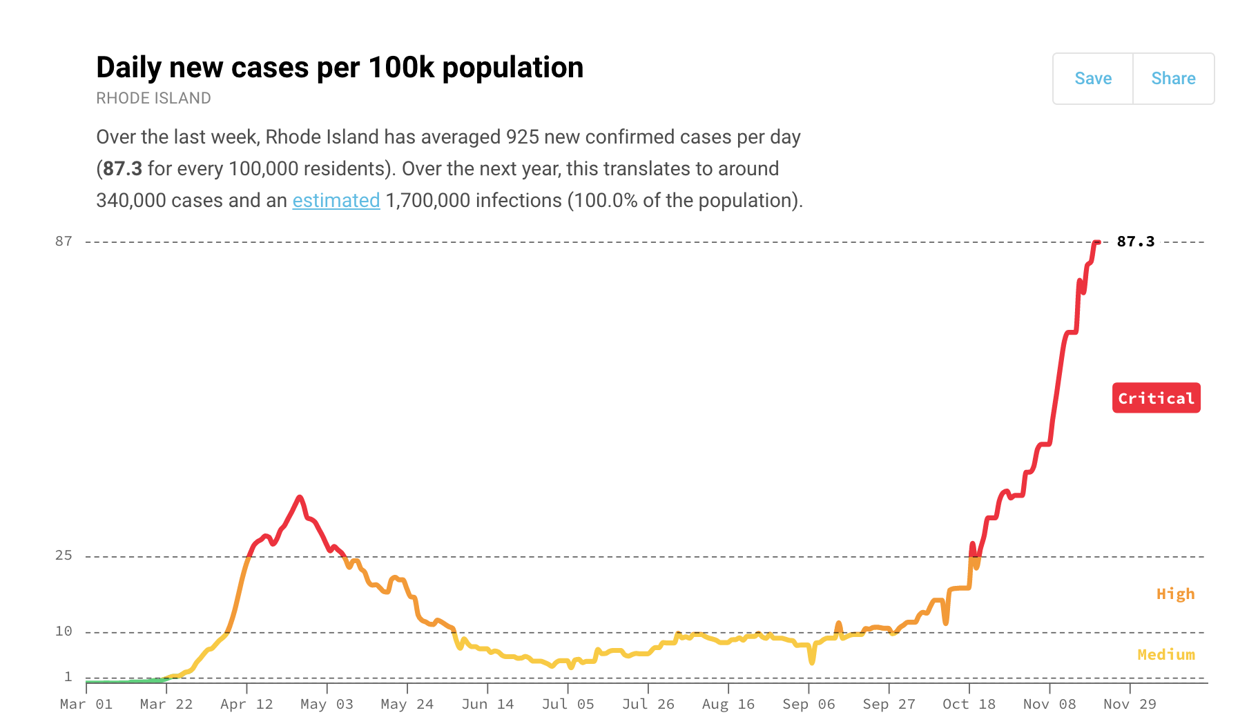 The graphic by covidactnow.org, experts from Georgetown University, Stamford University, and the Harvard Global Health Institute, now forecasts 1.7 million infections in Rhode Island over the next year. In a state with a population of just over a million. Let that sink in for a minute. Unless some radical changes are made, it’s predicted that everyone in Rhode Island will become infected with the coronavirus.