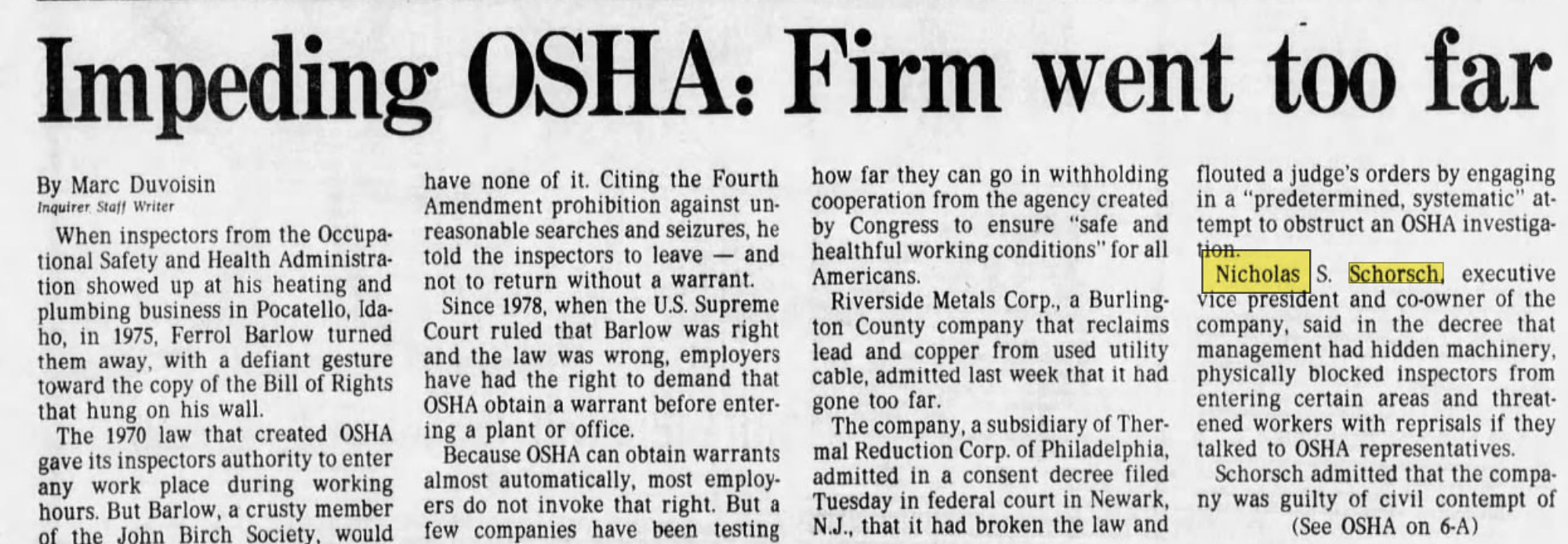 However, months later, as the Inquirer reported, Schorsch signed a 23-page consent decree that “described an extensive effort to hinder and obstruct OSHA investigation from mid-May to mid-August. Further, the company admitted it had 'carried out a predetermined, systematic plan' to prevent OSHA inspectors from observing and photographing production processes and taking air samples. Schorsch and the company admitted that they gave 'the clear impression that anyone caught talking to OSHA inspectors would be disciplined or fired.'"