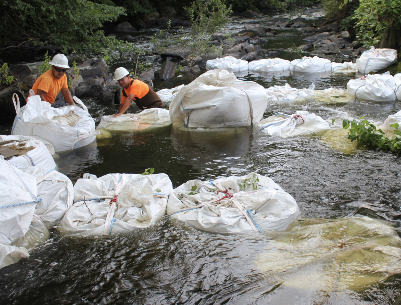 The in-river model consists of dozens of sandbags and 30 sand-filled supersacks, each weighing up to 3,400 pounds. The sacks were lowered into the Ten Mile River by a special long-arm excavator capable of reaching 150 feet.