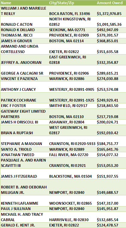 Ronald Acton of North Kingstown is the only other member of the list who owes more than $1 million to the state. Rounding out the top five delinquents are Ronald Dillard ($492,947.09), Thomas Ricci ($379,391.57) and James Grover ($368,853.01).