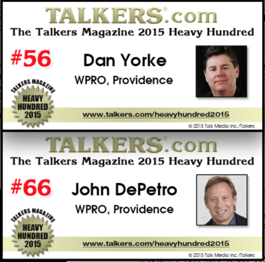 WPRO Radio’s midday host Dan Yorke and late-morning host John DePetro have made Talker Magazine’s 2015 “Heavy Hundred” list of radio personalities in the United States.