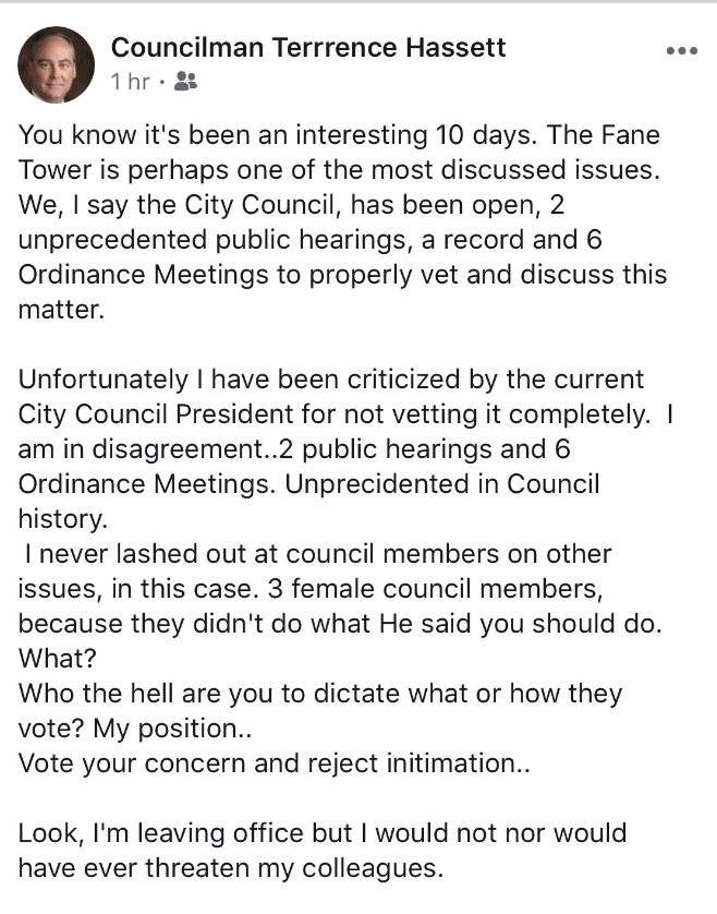 GET THE LATEST BREAKING NEWS HERE -- SIGN UP FOR GOLOCAL FREE DAILY EBLAST“You know it's been an interesting 10 days. The Fane Tower is perhaps one of the most discussed issues. We, I say the City Council, [have] been open, 2 unprecedented public hearings, a record, and 6 Ordinance Meetings to properly vet and discuss this matter,” wrote Hassett.