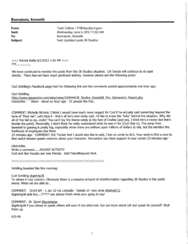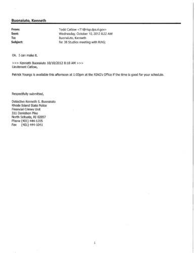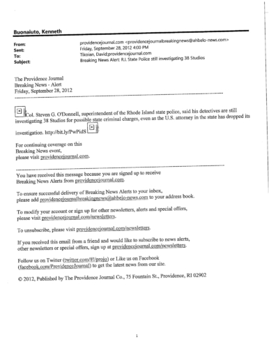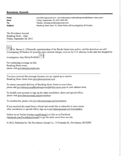 Attorney General Peter Kilmartin and Col. Steven O'DonnellOne of Rhode Island's top attorneys, Max Wistow, told the Rhode Island State Police that the State of Rhode Island had grounds for pursuing a criminal case against 38 Studios, according to a four-year-old Rhode Island State Police email released on Wednesday.