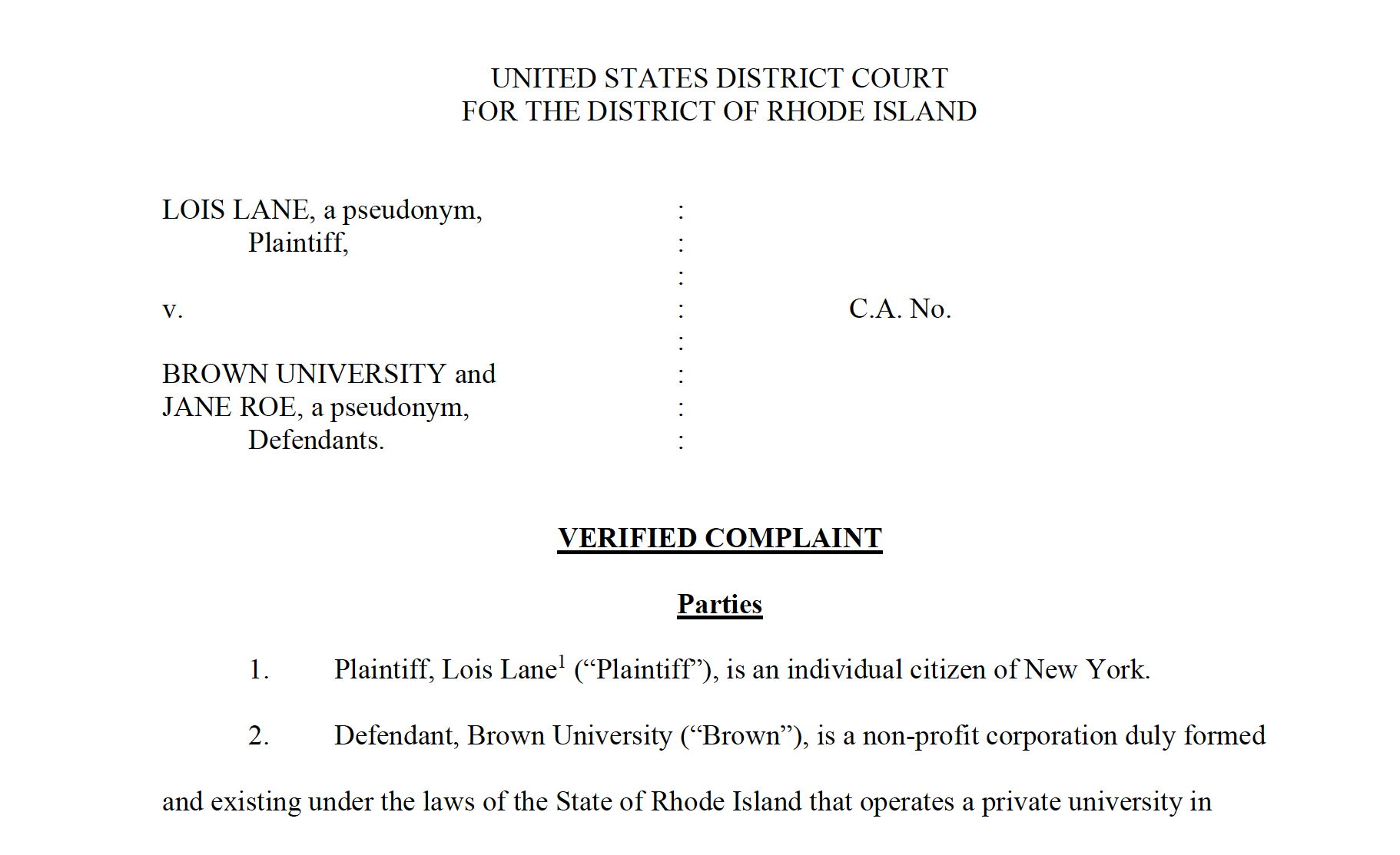 Lane’s suit states, “Title IX prohibits Brown from discriminating against Plaintiff based on sex, including on the basis of being a transgender female, in connection with any educational program or activity" and that "plaintiff has been the victim of severe, pervasive, and objectively offensive sexual harassment and gender-based discrimination by Jane Roe, a school peer. The gender-based discrimination and harassment has caused Plaintiff to be deprived of educational opportunities and benefits.”
