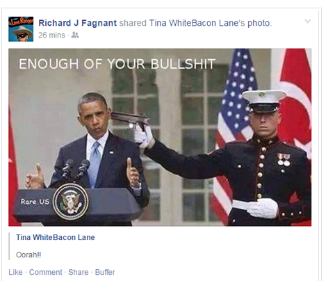 In Woonsocket, former Mayoral candidate Dave Fisher called out on The Coalition a picture he said was shared by Woonsocket zoning official Richard Fagnant on his Facebook page that depicted a Marine holding a gun to President Obama's head.