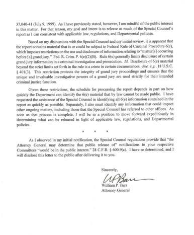 U.S. Attorney General Barr's Letter to Congressional Leaders on Mueller Report - READ THE LETTER