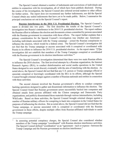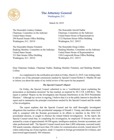 The letter with an overview comes just two days after the conclusion of a two year investigation into Russia’s attempts to sabotage the 2016 election and whether President Trump or any of his associates conspired with Moscow’s interference. The report was conducted by former FBI Director Robert Mueller.