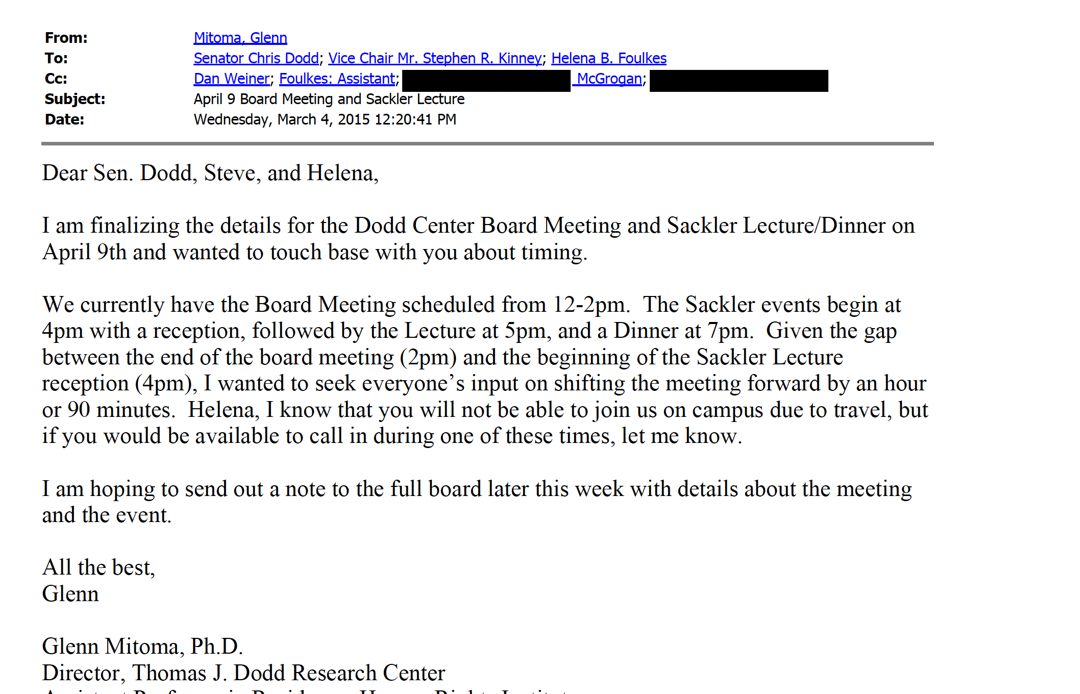 An email dated March 2015, from Glenn Mitoma, executive director of the Dodd Center to Foulkes, her uncle former Senator Dodd, and Dodd’s long-time political advisor Stephen Kinney — GOLOCAL WILL PUBLISH A SEPARATE REPORT ABOUT KINNEY.