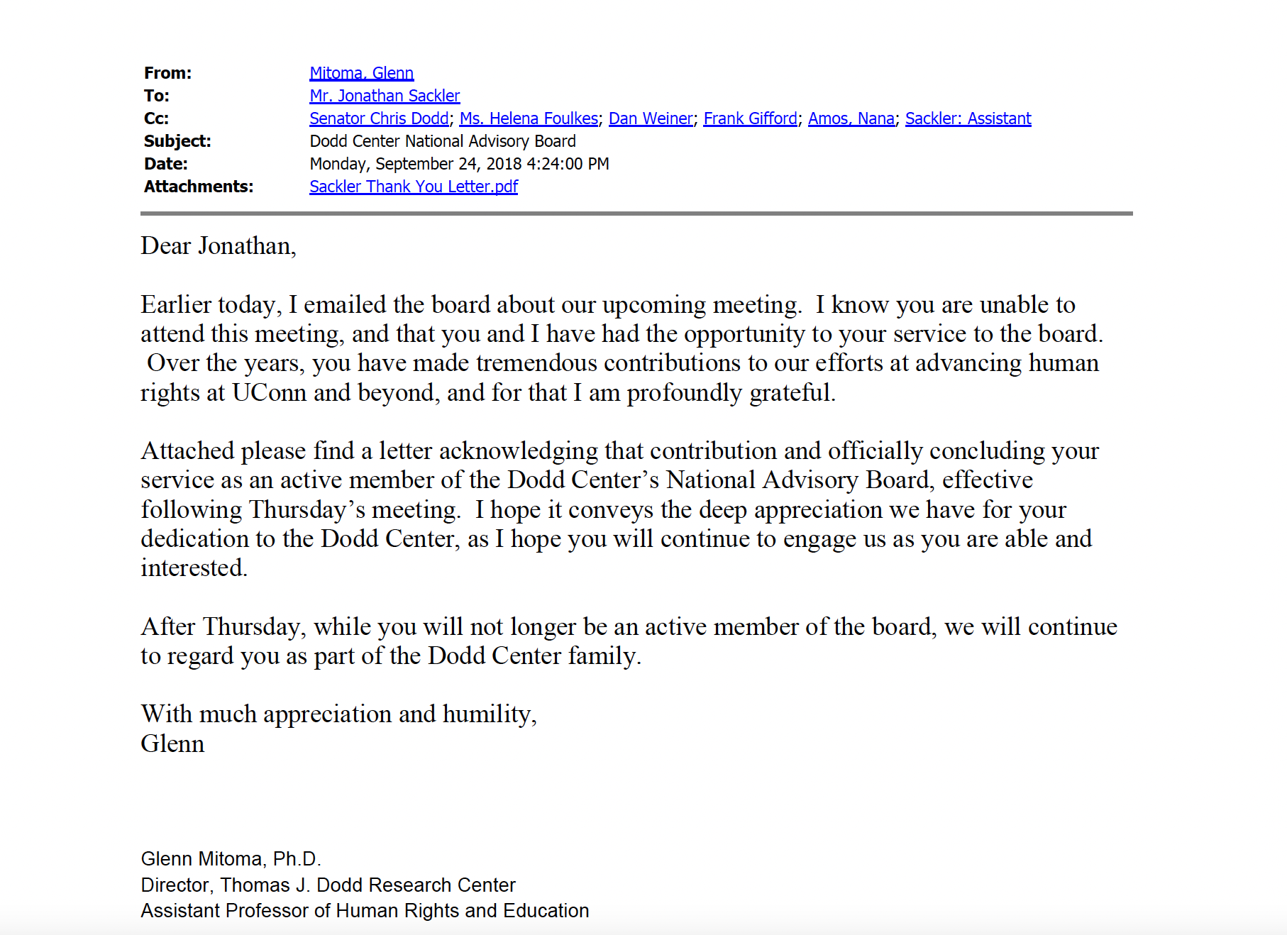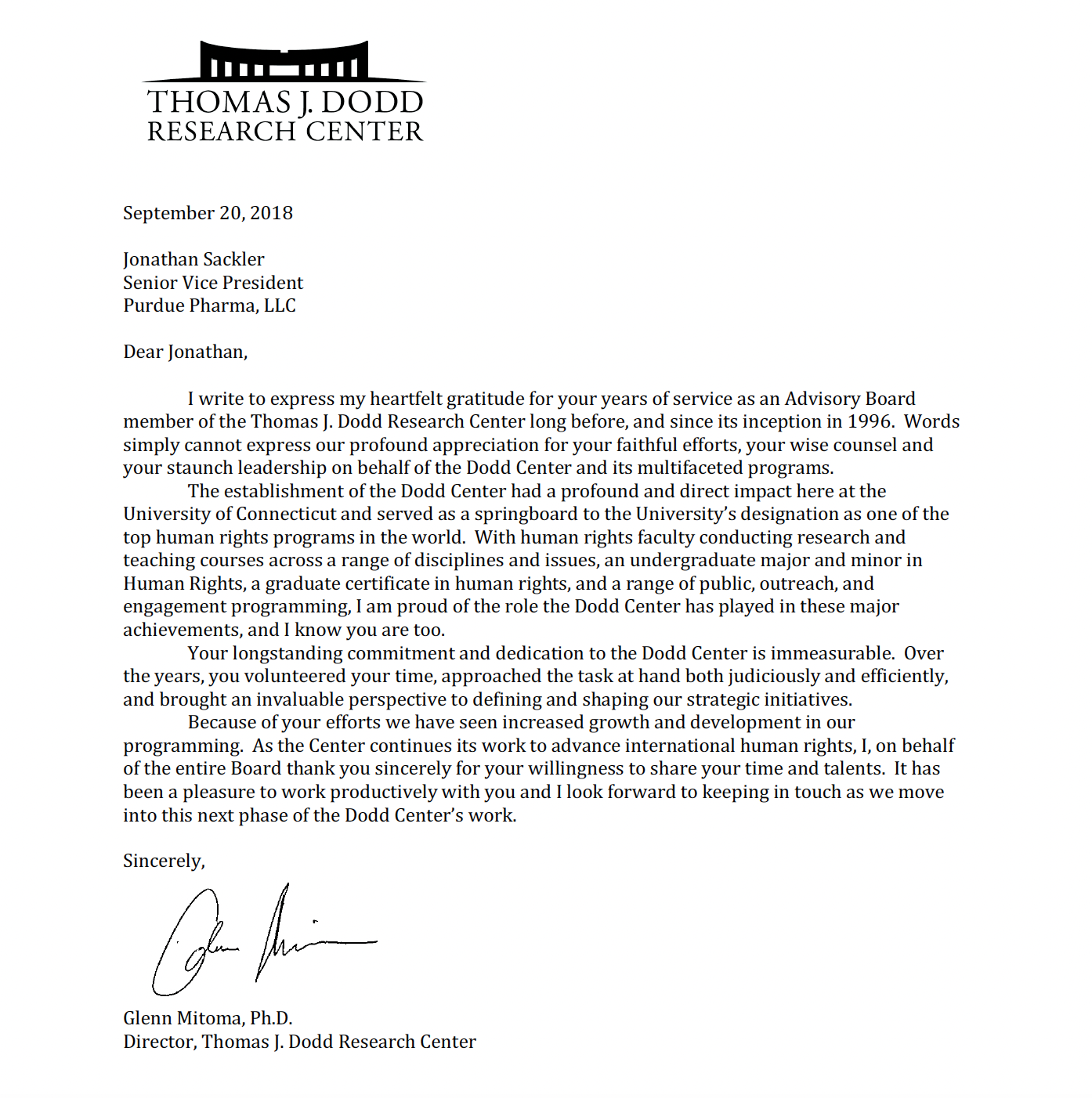 In a letter to Sackler dated September 20, 2018, related to the email, the Dodd Center wrote to Jonathan Sackler, “I write to express my heartfelt gratitude for your years of service as an Advisory Board member of the Thomas J. Dodd Research Center long before, and since its inception in 1996. Words simply cannot express our profound appreciation for your faithful efforts, your wise counsel and your staunch leadership on behalf of the Dodd Center and its multifaceted programs.”