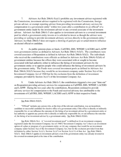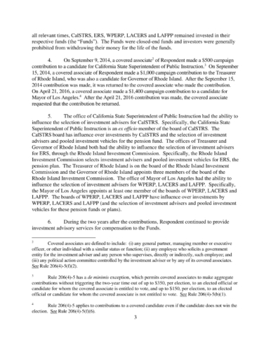 According to the SEC, "Between September 2014 and April 2016, three covered associates of Respondent made campaign contributions to candidates for elected office in California and Rhode Island, which offices had influence over selecting investment advisers for public pension plans in those states. Within two years after these contributions, Respondent provided advisory services for compensation to the public pension plans. By providing those advisory services for compensation within two years after the contributions, Respondent violated Section 206(4) of the Advisers Act and Rule 206(4)-5 thereunder."
