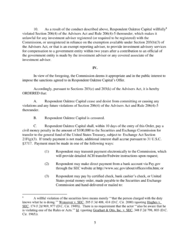 As a part of the agreement between the SEC and Oaktree, “As a result of the conduct described above, Respondent Oaktree Capital willfully violated Section 206(4) of the Advisers Act and Rule 206(4)-5 thereunder, which makes it unlawful for any investment adviser registered (or required to be registered) with the Commission, or unregistered in reliance on the exemption available under Section 203(b)(3) of the Advisers Act, or that is an exempt reporting adviser, to provide investment advisory services for compensation to a government entity within two years after a contribution to an official of the government entity is made by the investment adviser or any covered associate of the investment adviser.”