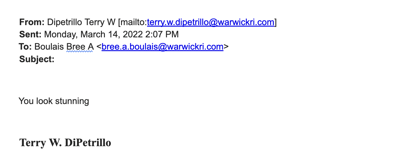 In her complaint; Boulais said that on March 14, 2022, "After she reported the sexual harassment," she received an email from DiPetrillo saying “You look stunning.”