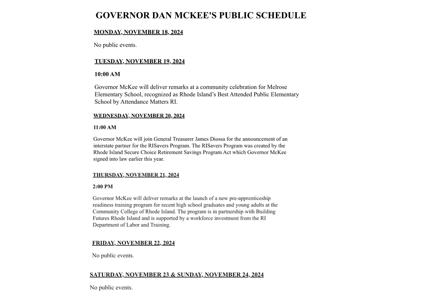 What Does Governor McKee’s Schedule Look Like?