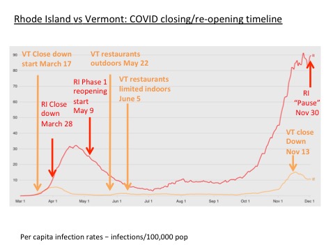 Rhode Island waited too long to close, then started reopening too soon, and continued reopening too quickly. Combined with incomplete, half-hearted measures with nonsensical exceptions to closures, these seem to have been the drivers to infections becoming so appallingly bad here.