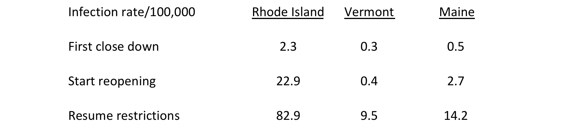 Rhode Island also started reopenings while infection rates were still high, much greater than in Vermont and Maine. Those two states waited until infection rates were reduced to very low levels and stayed down for several weeks before starting any reopening. Rhode Island started reopening when infection rates were beginning to trend down but were still at high levels, much higher than were seen at any time in Vermont or Maine.