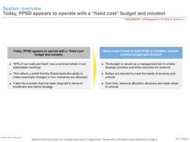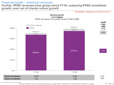 Ernest & Young study cost $295,000An analysis released at 12:00 AM Friday morning by the Rhode Island Department of Education conducted by the national consulting group Ernst and Young (EY) analyzed the Providence School system’s budget and identified that there may be more flexibility in how dollars are deployed than previously identified.