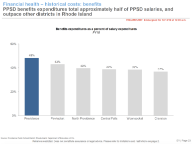 The cost of benefits to school department employees is nearly 50 percent (49%) of salary expenditures -- and is 32 percent higher than Cranston.