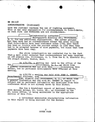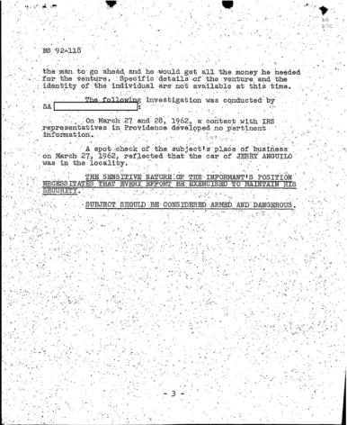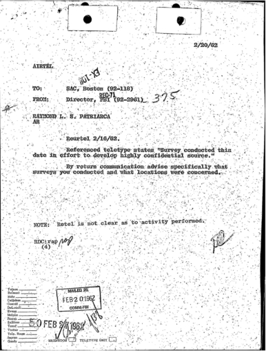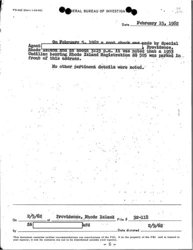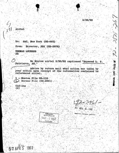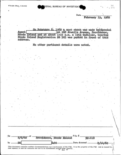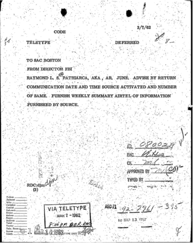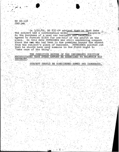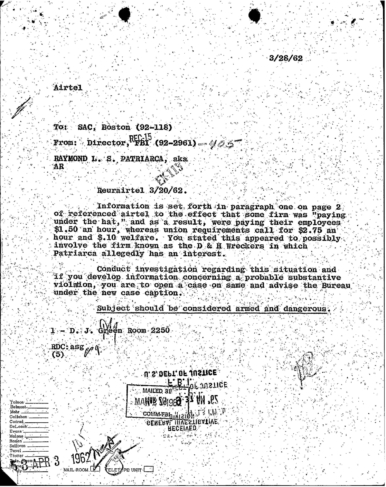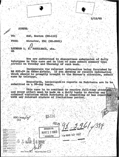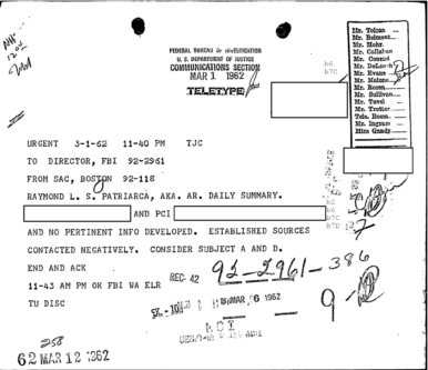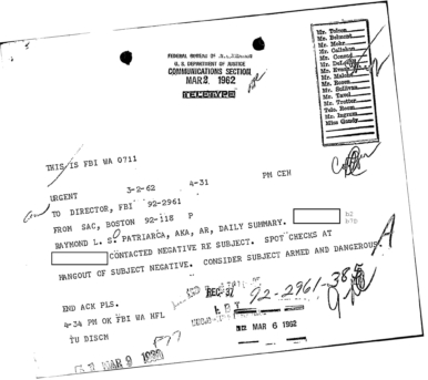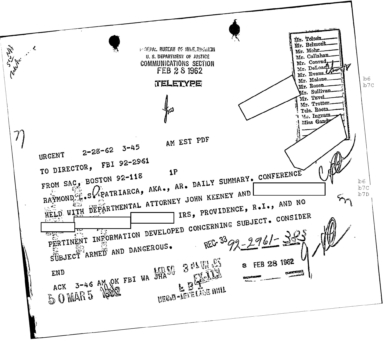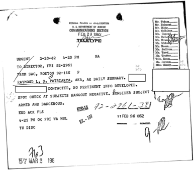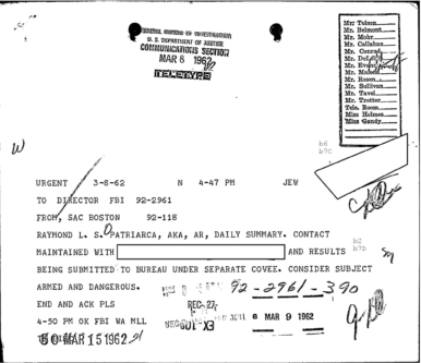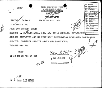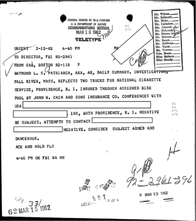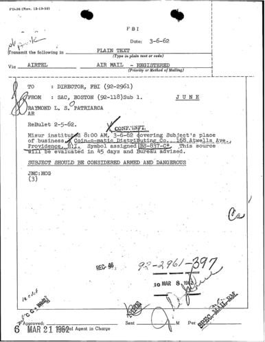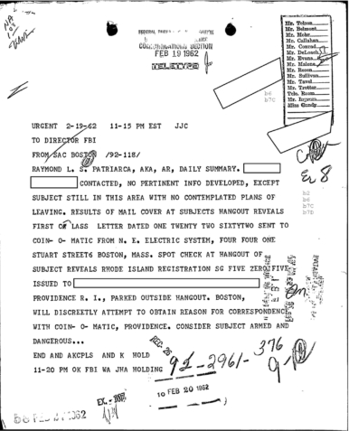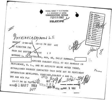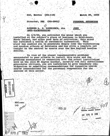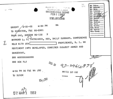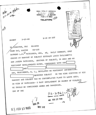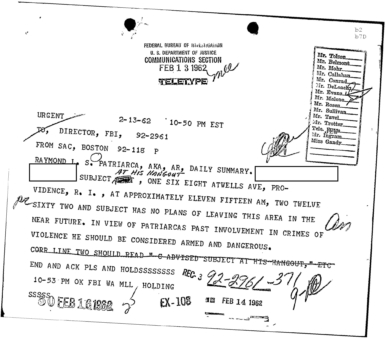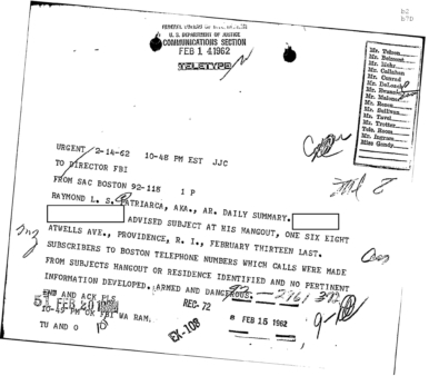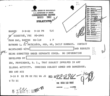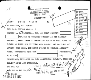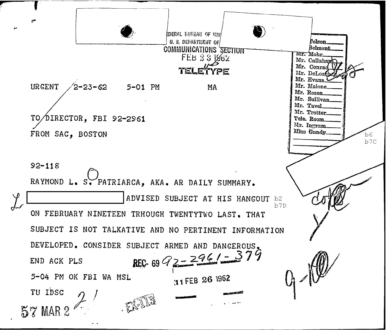 “Patriarca believed this man could be taking pictures of his business place and the person who frequent it. In addition, he was worried because the man could be very effectively use a rifle from behind the draperies. Patriarca said (to an informant) he intend to send one of his men to this apartment on 3/16/62 disguised as a mechanic and effectively resolve this situation.”