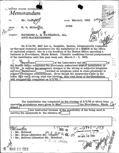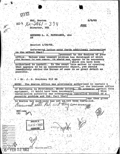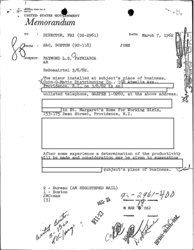 In a highly redacted section of the FBI file, it appears that the staff at New England Telephone balked at the wiretap on Raymond Patriarca’s: