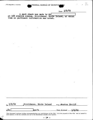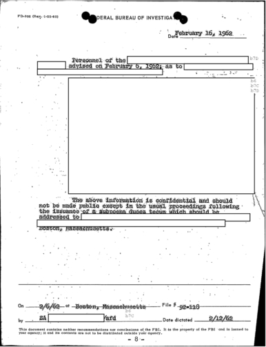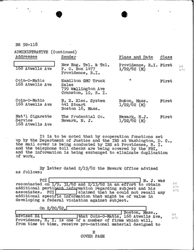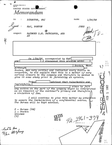 “Today REDACTED advised that reluctantly and regretfully REDACTED since he felt any action on part of the company might be interpreted as an invasion of the customer’s privacy and therefore a violation of law,” according to the Memo from the Boston Office of the FBI to J. Edgar Hoover.