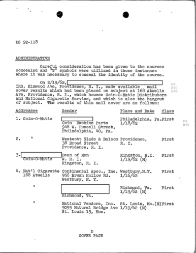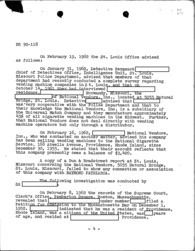 A January of 1962 FBU unveils that an informant says he saw Raymond Patriarca go towards the cellar of the Coin-O-Matic and reach for a “Gray-type book which appeared to be a record-type of book.”